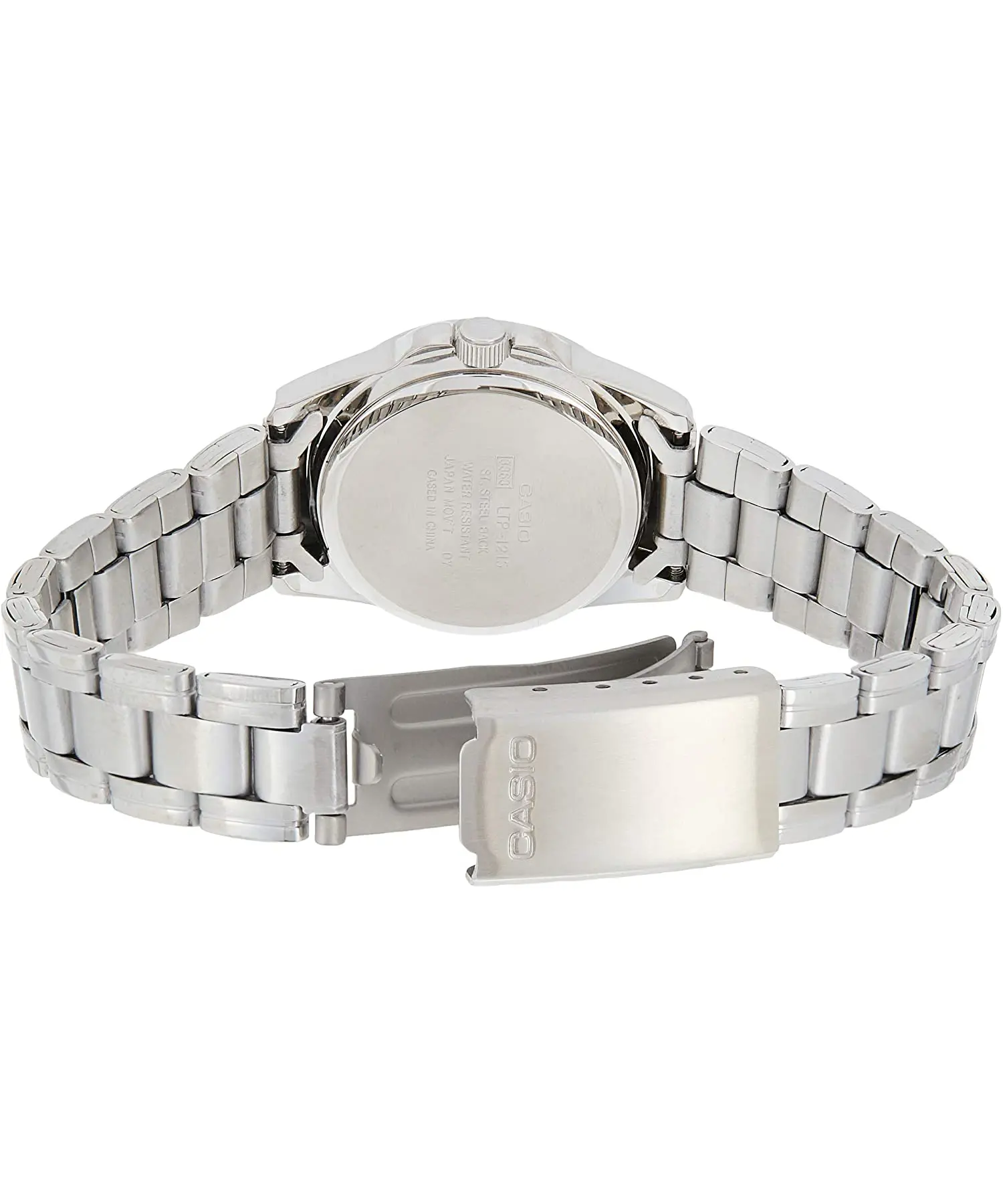 ساعت LTP-1215A-7ADF با قطر قاب ۲۸ میلیمتر و ضخامت ۹ میلیمتر، ظاهری ظریف و زنانه دارد که بهخوبی روی مچ قرار میگیرد. قاب آن از جنس برنج با روکش استیل ضدزنگ ساخته شده که هم سبک است و هم در برابر ضربه و خطوخش مقاومت خوبی دارد. بند استیل با طراحی ساده و رنگ نقرهای، حس لوکس بودن را بدون اغراق منتقل میکند.