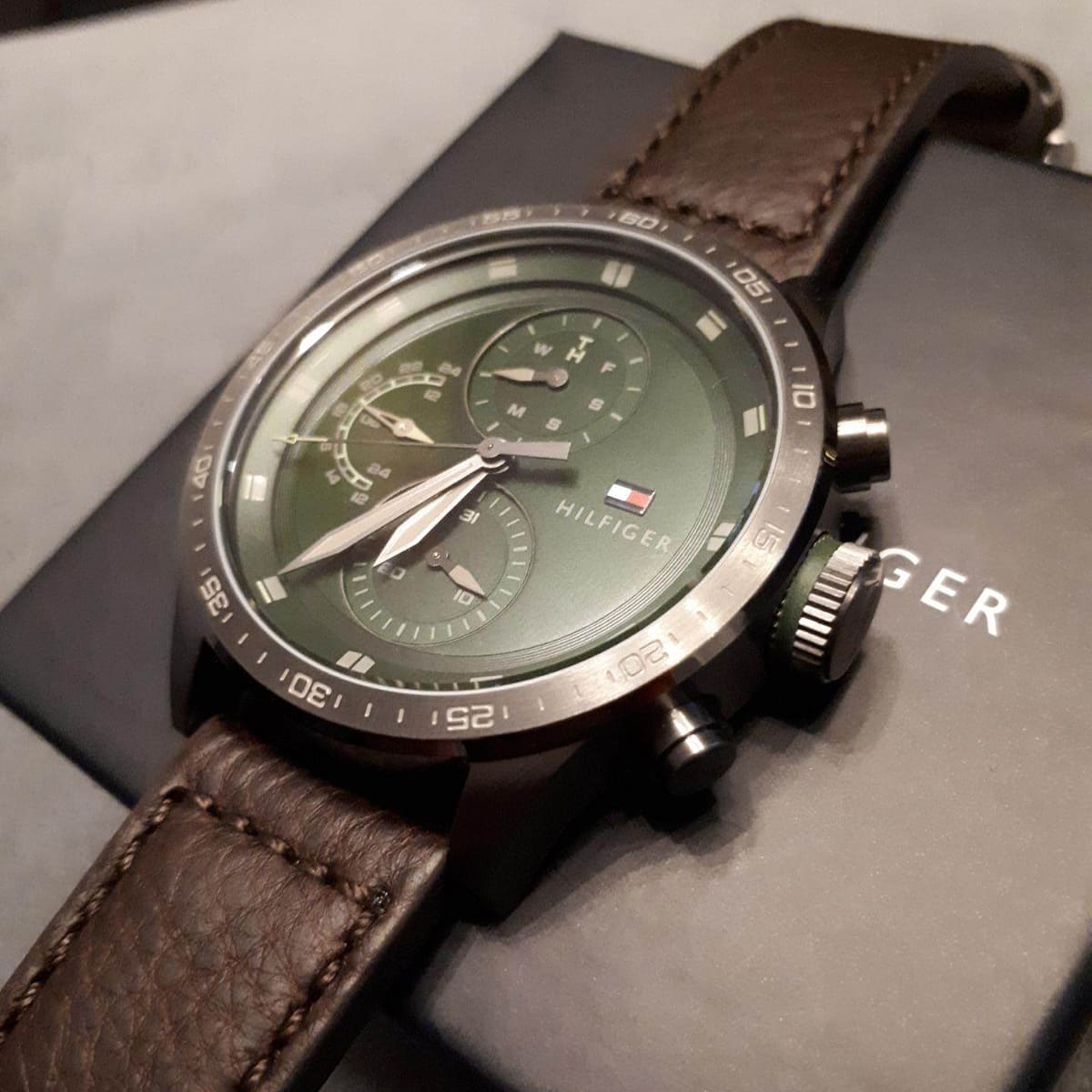 Tommy Hilfiger 1791809 با صفحهی سبز آفتابی و قاب خاکستری یونی، جلوهای خاص و متفاوت دارد. بند چرمی قهوهای از جنس چرم طبیعی، حس کلاسیک و راحتی را منتقل میکند. جزئیات طلایی و نشانگرهای چندگانه روی صفحه، علاوه بر زیبایی، عملکردی کاربردی دارند.
