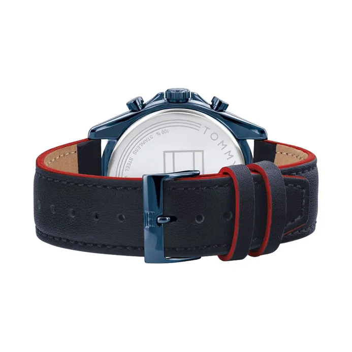 این مدل با صفحهی آبی برسخورده عمودی و قاب استیل یونی آبی تیره، جلوهای خاص و مردانه دارد. بند چرمی آبی با سگک کلاسیک، حس راحتی و لوکس بودن را همزمان منتقل میکند. لوگوی Tommy Hilfiger در موقعیت ساعت ۳، امضای برند را با ظرافت به نمایش میگذارد.