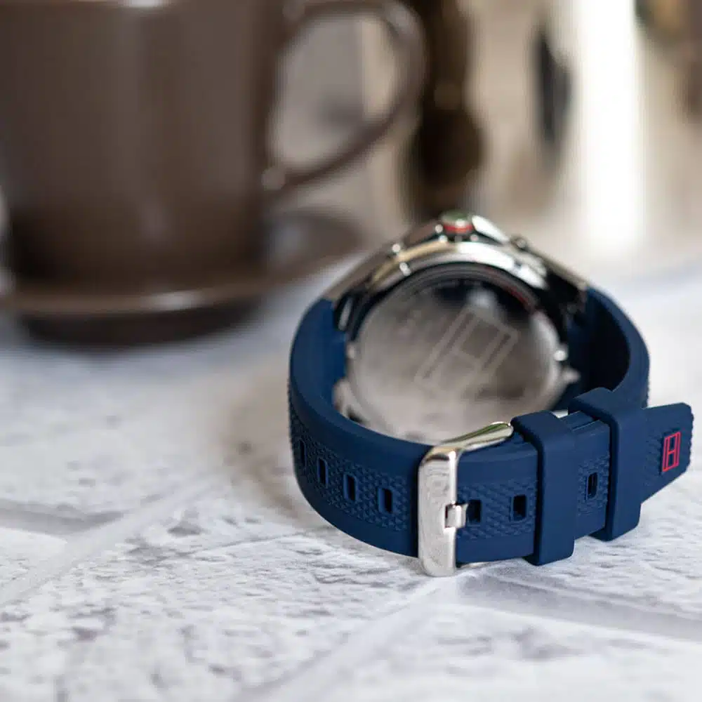 - بند سیلیکونی آبی تیره با لبههای بافتدار و لوگوی برجستهٔ Tommy Hilfiger، هم راحتی داره هم جذابیت بصری.