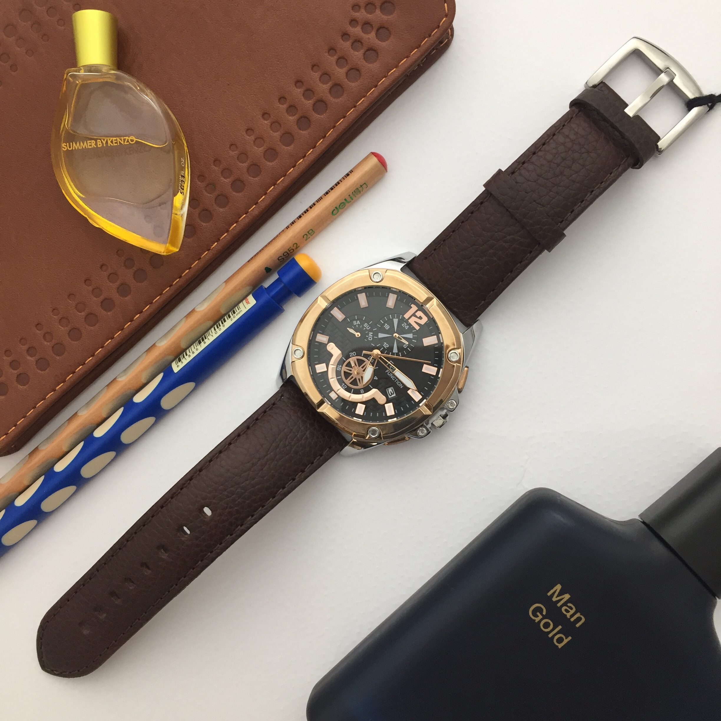 بند چرمی این مدل از چرم طبیعی با کیفیت بالا ساخته شده که با گذر زمان نه‌تنها دوام خود را حفظ می‌کند، بلکه جلوه‌ای کلاسیک‌تر و دلنشین‌تر پیدا می‌کند. رنگ قهوه‌ای بند، انتخابی هوشمندانه برای کسانی است که به دنبال ساعتی هستند که با کت‌وشلوار رسمی، تی‌شرت ساده یا حتی لباس‌های پاییزی و زمستانی به‌خوبی ست شود.