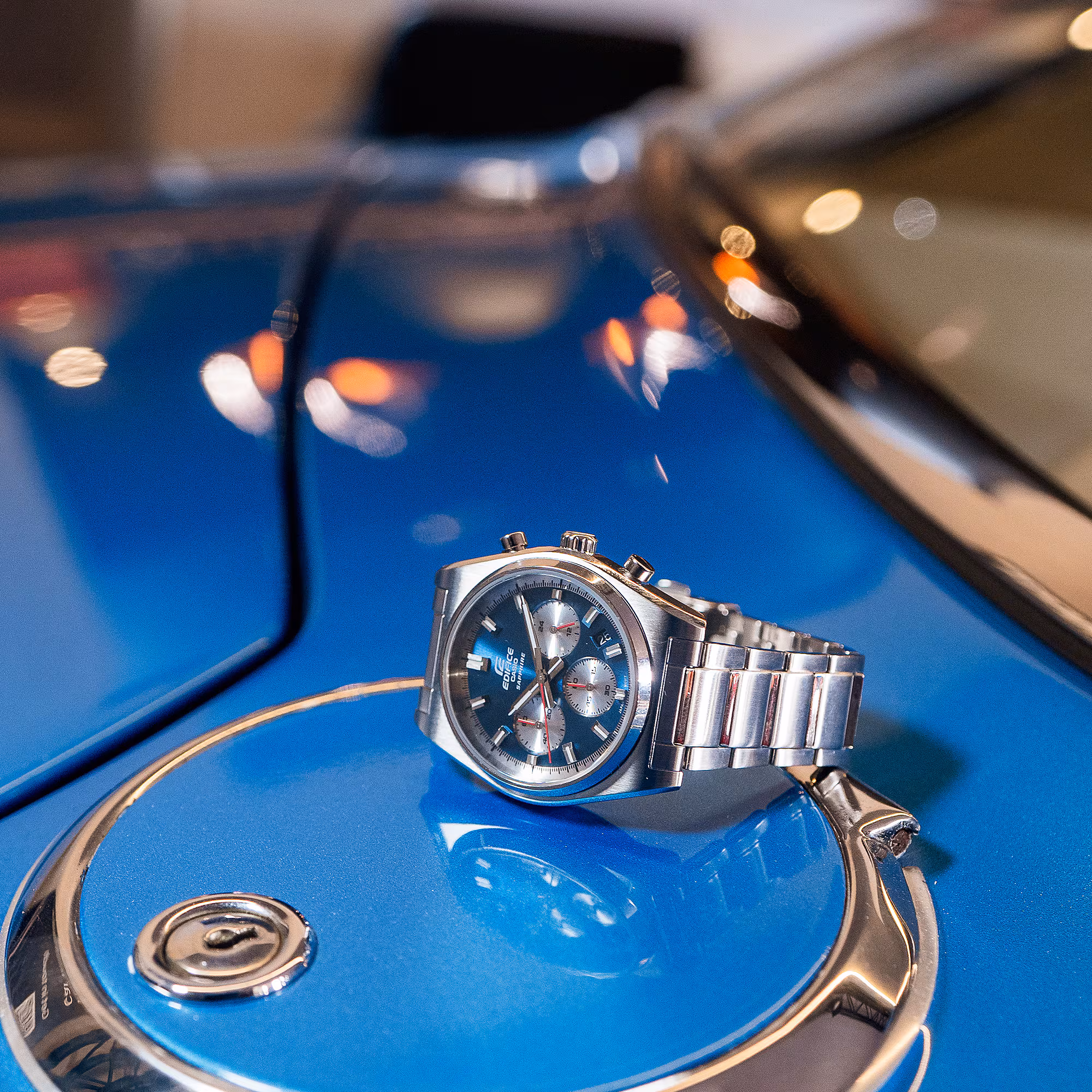 ساعت EFB-730D-2AVUDF از سری EDIFICE، فراتر از یک ابزار زمانسنجی است؛ این مدل با الهام از داشبورد خودروهای اسپرت کلاسیک طراحی شده است. چینش سهگانه صفحه (۳-۶-۹) یادآور سرعتسنجهای مسابقهای است، و خطوط برجسته روی صفحه، حس حرکت و دینامیک را القا میکنند. قاب استیل صیقلی و صفحه مشکی دودی، ترکیبی از قدرت و ظرافت را به نمایش میگذارد—مثل یک کوپه ژاپنی که در جادههای کوهستانی میدرخشد.