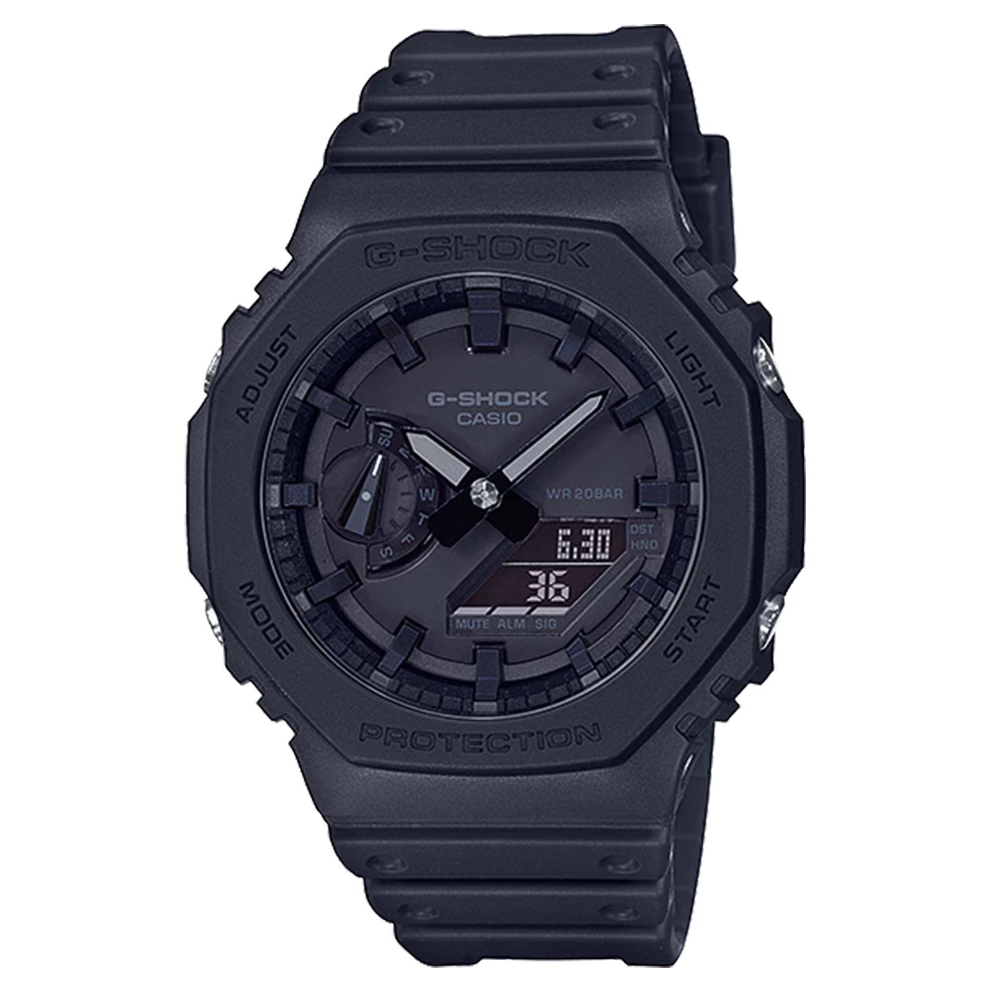 ظاهر ساعت GA-2100 با الهام از ابزارهای حرفهای هوانوردی طراحی شده و تمرکز آن بر خوانایی بالا و عملکرد دقیق است. قاب هشتضلعی و خطوط زاویهدار، حس اقتدار و آمادگی را به کاربر منتقل میکند.
